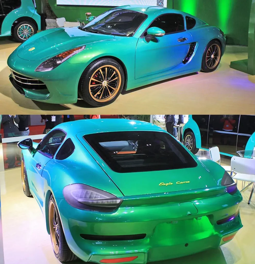 Le comparatif : Les designers ne savaient pas choisir, alors ils ont pris les deux. Le nez, les phares et la calandre sont 100% Ferrari. La ligne de toit, les hanches et l’arrière sont 100% Porsche. Et le logo ? C’est une copie du blason Porsche… mais avec une tête d’aigle.