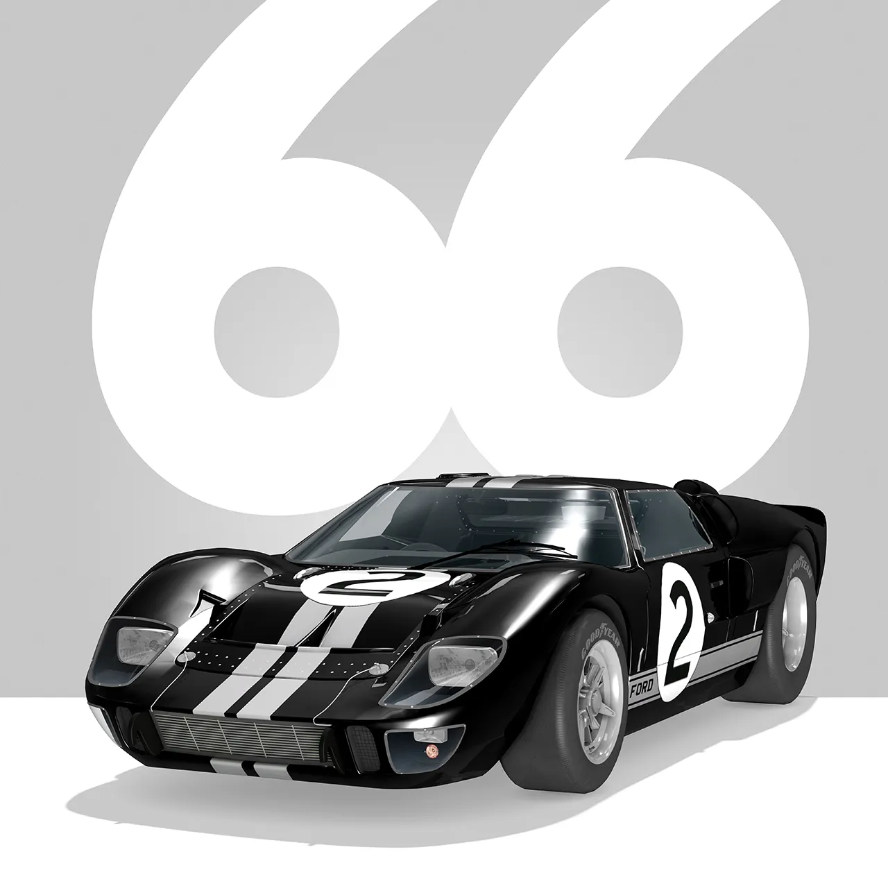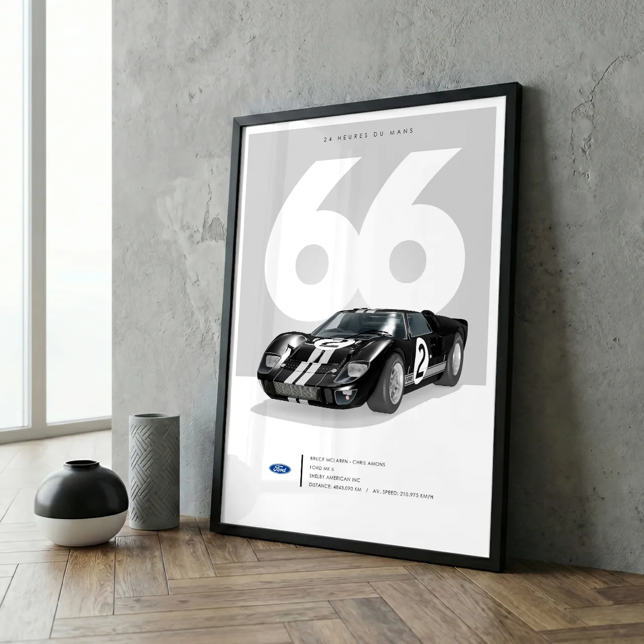 Imprimée sur papier premium, cette affiche minimaliste capture l’essence même de la puissance américaine qui a conquis la Sarthe en 1966.