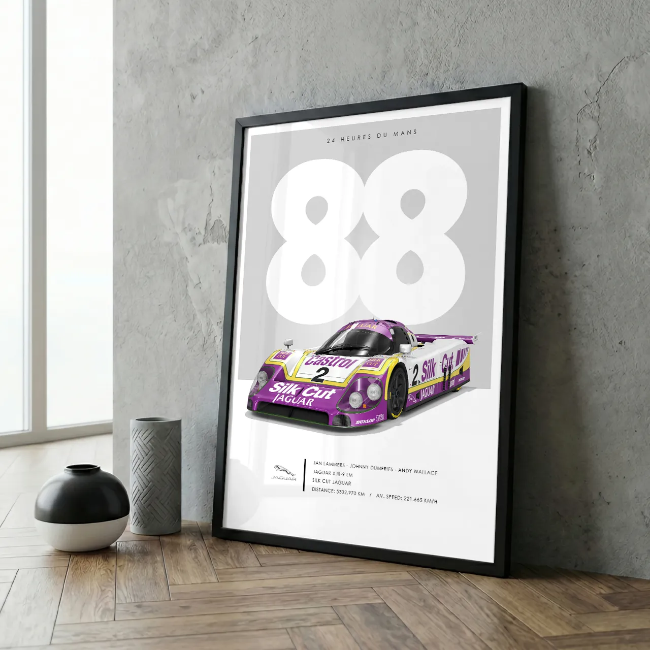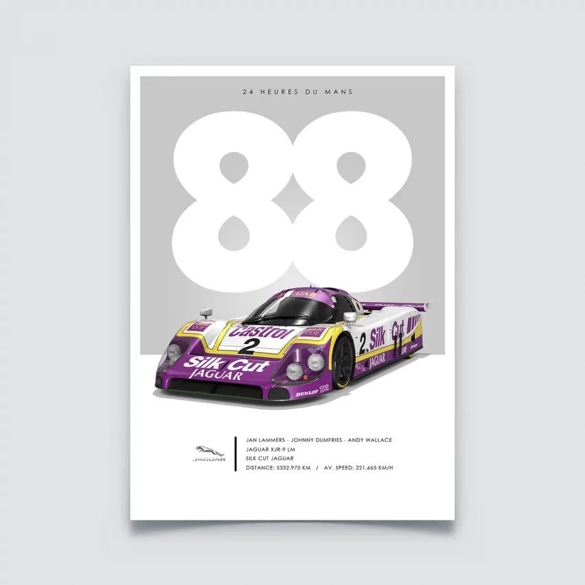 Cette affiche de la collection 24 heures du Mans met en avant l’année « 88 » stylisée en fond blanc sur gris, la voiture, magnifique dans sa livrée violette, blanche et jaune Silk Cut, les données historiques en bas de poster : le trio de pilotes (Jan Lammers, Johnny Dumfries, Andy Wallace), la team Silk Cut Jaguar, une distance folle de 5332 km et une vitesse moyenne de 221 km/h.