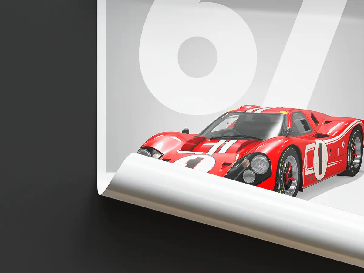 Une affiche pour retracer la victoire de Shelby en 1967 avec leur célèbre Ford Mk IV pilotée par Dan Gurney et Anthony Joseph Foyt.