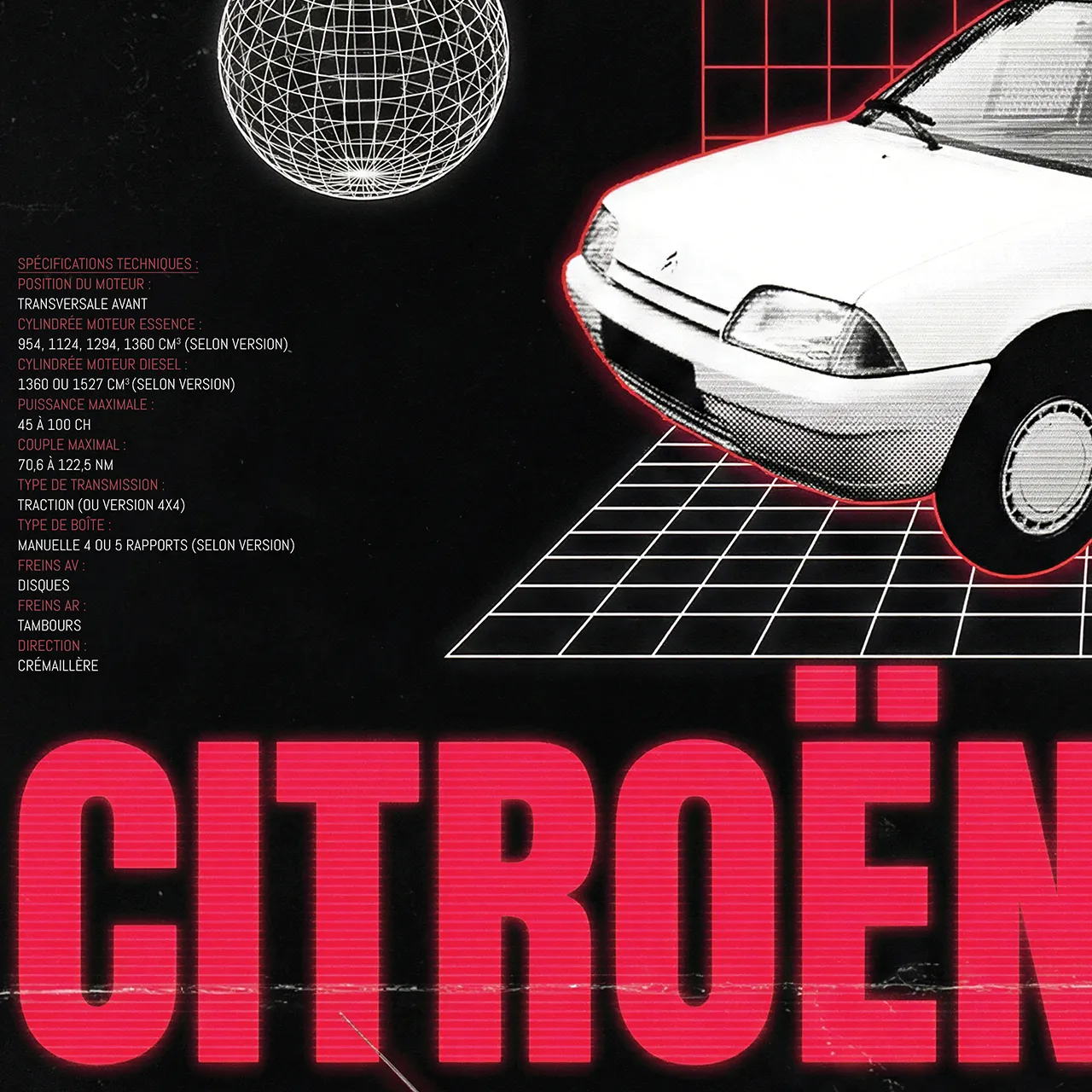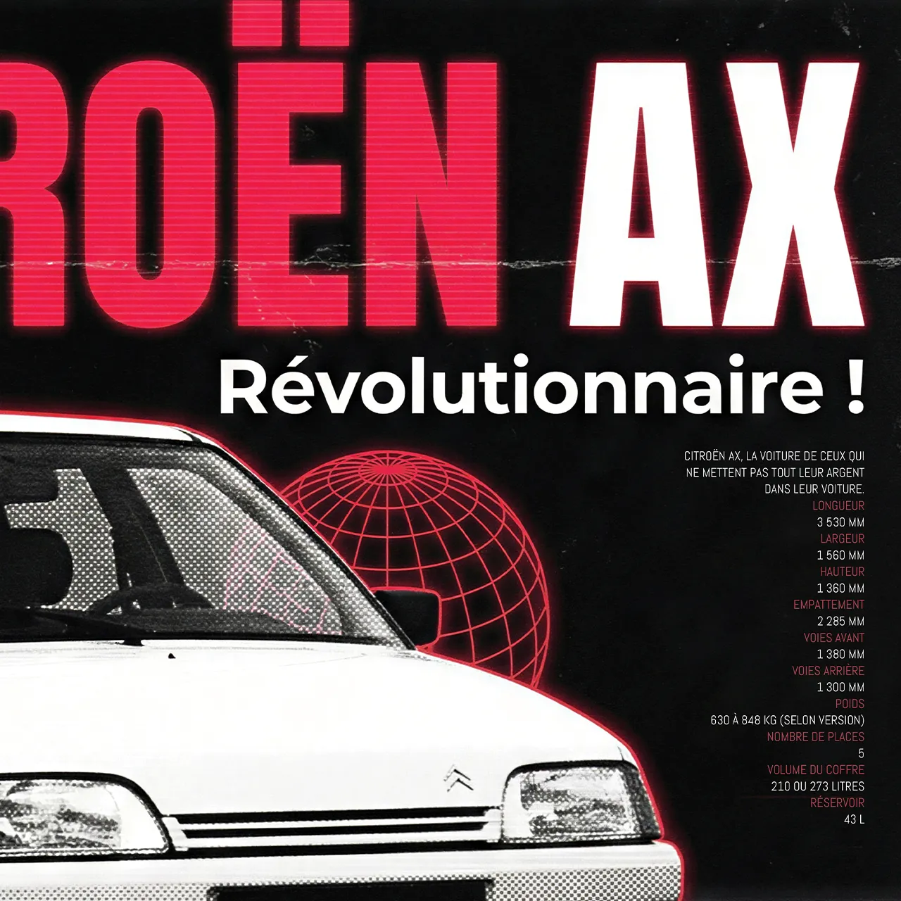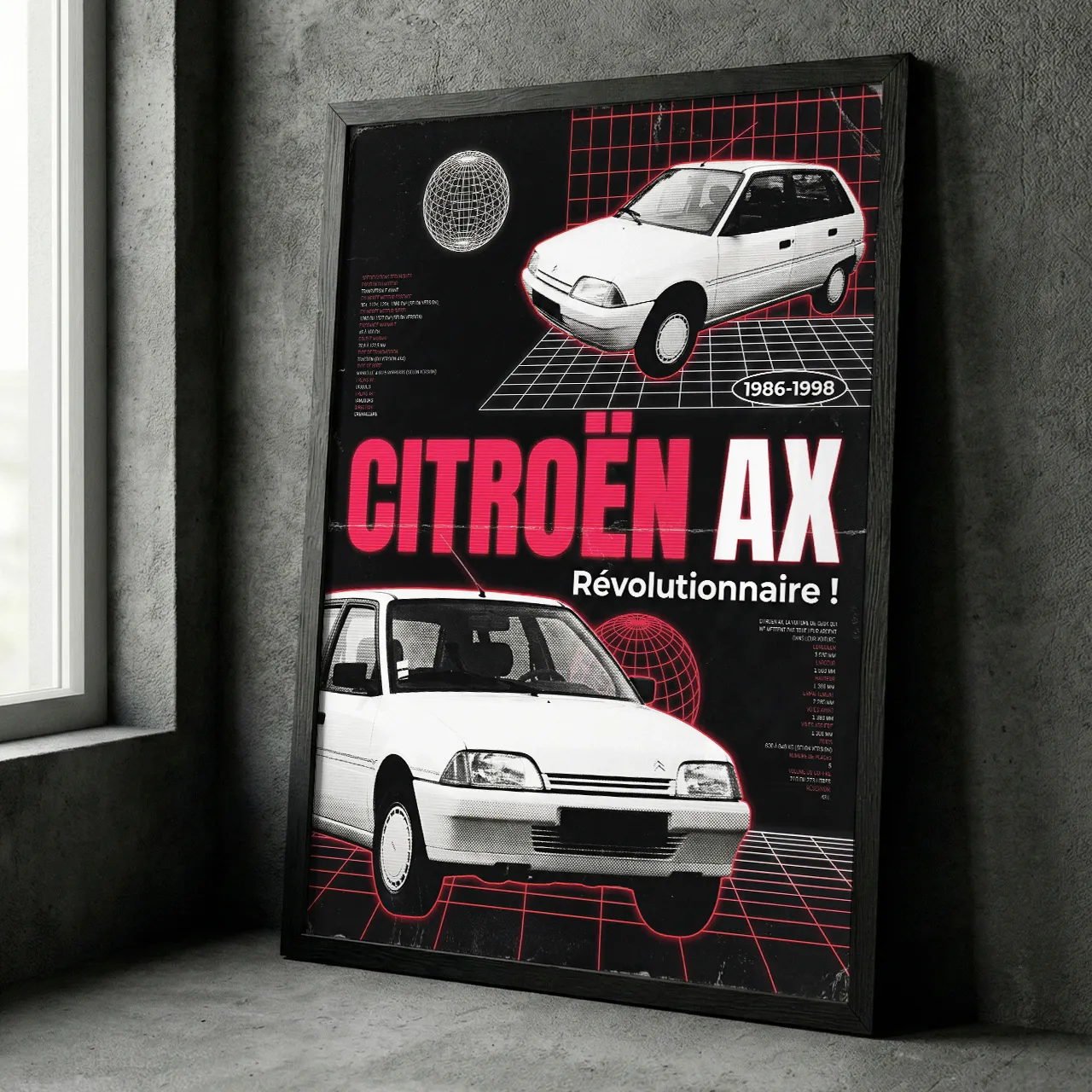Dévoilée en 1986, la Citroën AX a marqué son époque par sa chasse obsessionnelle aux kilos superflus et son coefficient de pénétration dans l’air record. Ce poster reprend les codes graphiques « high-tech » typiques de la publicité des années 80 (grilles rouges, globe filaire) pour sublimer cette citadine française devenue une véritable icône populaire.