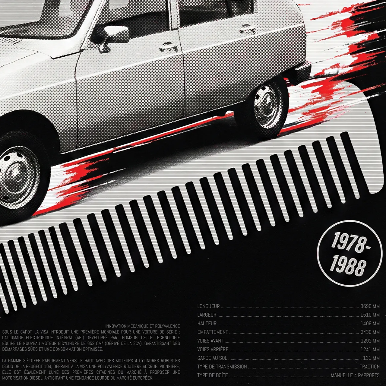 Lancée en 1978, la Citroën Visa a marqué les esprits par son design original et ses campagnes publicitaires iconoclastes. Ce poster capture l’essence de cette époque où l’humour et l’audace étaient rois, avec un clin d’œil direct au célèbre slogan « Ça décoiffe ! » incarné par le peigne géant et les effets de vitesse.