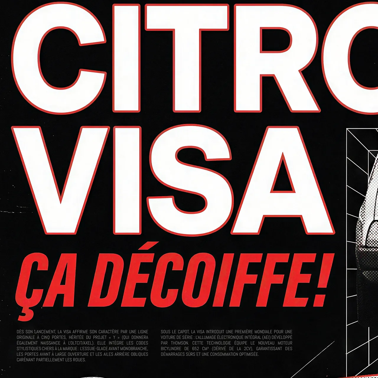 Mais c’est surtout grâce à la publicité que la Visa va entrer dans la légende populaire. La campagne télévisée mettant en scène une Visa GTi décollant d’un porte-avions ou décoiffant les passants sur son passage, accompagnée du slogan « Ça décoiffe ! », est devenue culte. Ce poster rend hommage à cet esprit irrévérencieux et à cette voiture qui, sous des airs de berline compacte sage, cachait un tempérament joueur, surtout dans ses versions sportives Chrono et GTi.