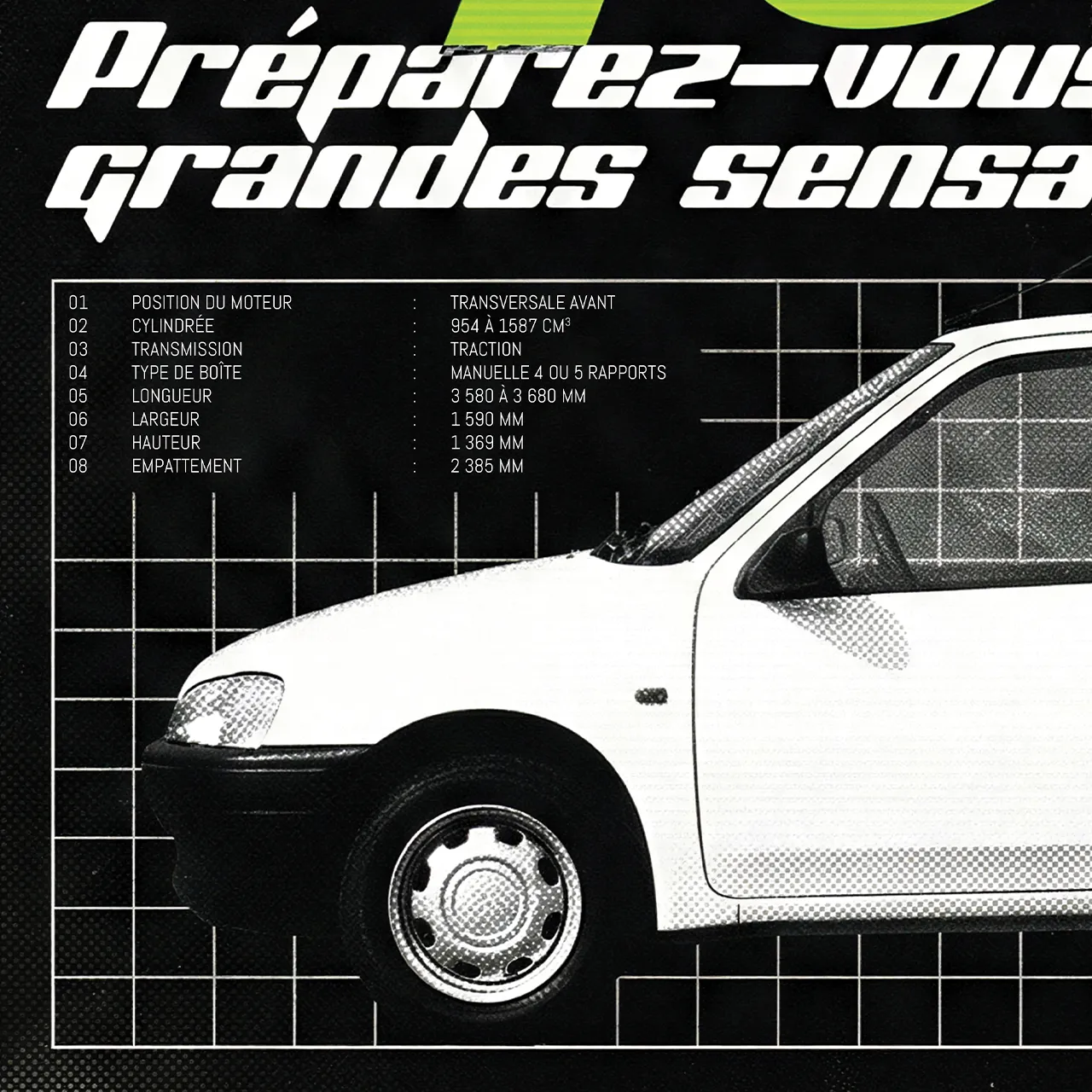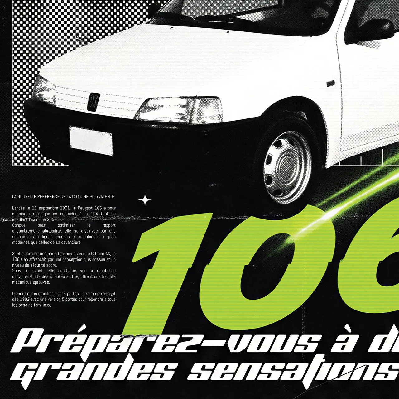 Agile. Compacte. Dynamique. Lancée en 1991, la Peugeot 106 est rapidement devenue une icône des citadines françaises, réputée pour son châssis affûté. Ce poster au style graphique percutant, avec ses accents vert néon électriques sur fond noir et ses trames techniques, capture l’énergie de cette « petite lionne » qui promettait, comme l’indique son slogan, de « grandes sensations ».