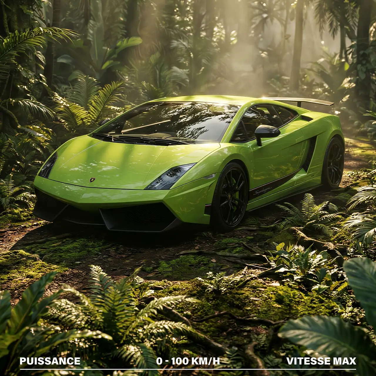 Une composition visuelle « Organique ». Ce poster de la collection Super Sport joue la carte du mimétisme : le vert éclatant de la carrosserie répond aux nuances profondes de la forêt vierge.