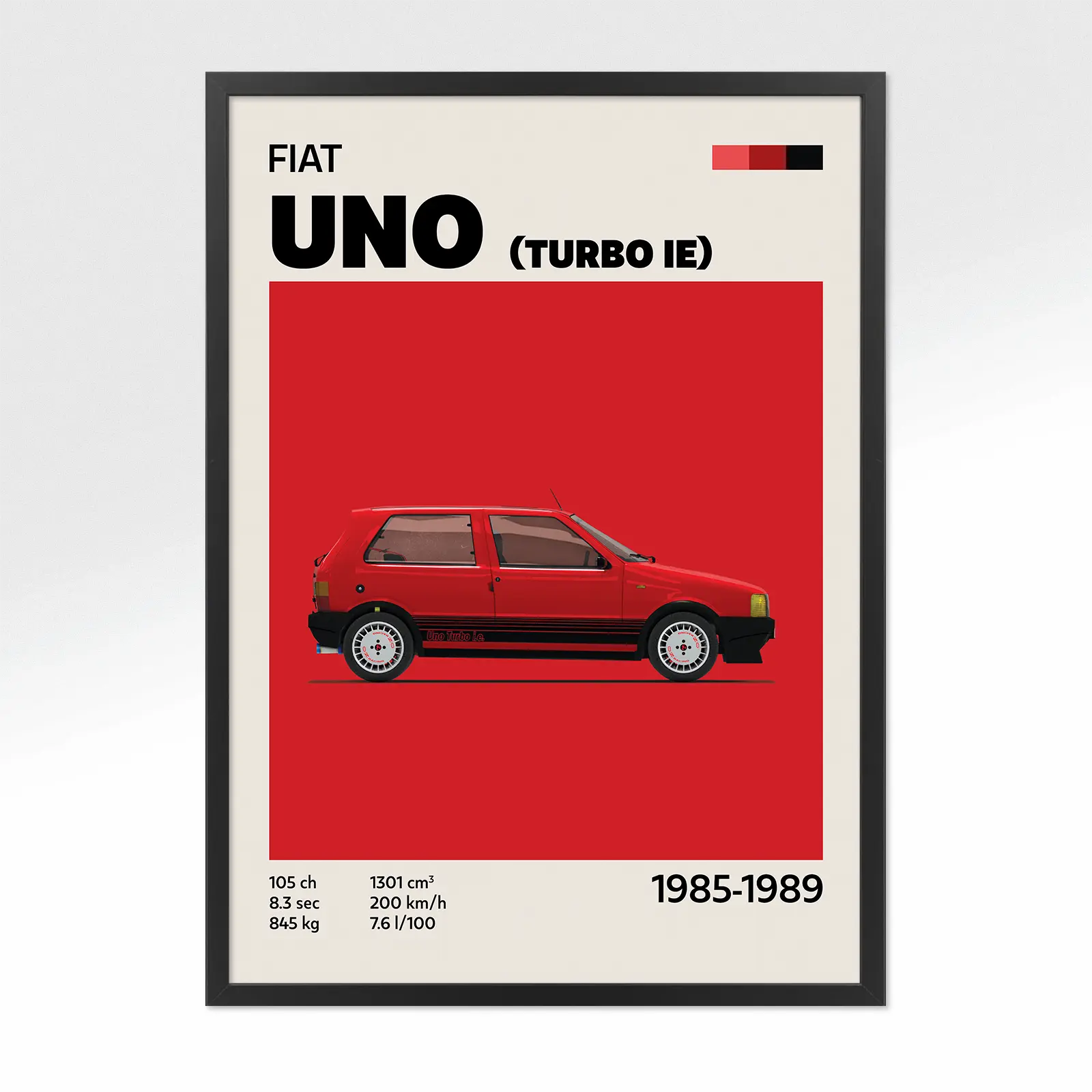 Retour en 1985 avec ce poster illustrant la voiture compacte mythique de Fiat: la Uno Turbo IE. Retrouvez les caractéristiques principales de cette voiture dans un poster sobre et élégant.